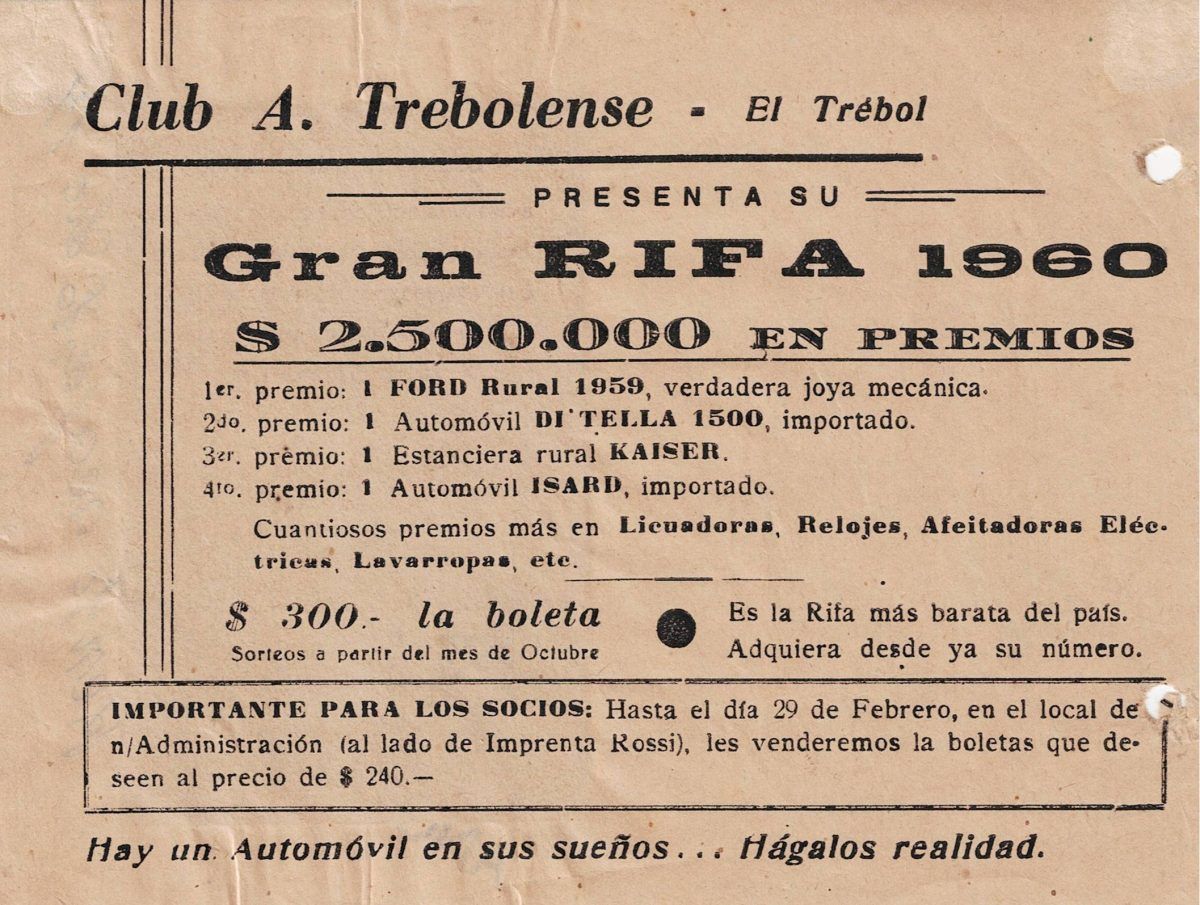 Club Trebolense comienza con las rifas en 1958, en un apartado de la Secretaría del Club que funcionaba en Bv. América 940 (El local era propiedad de Leon Etbul, hoy Cristina Ferratto), como hemos mencionado. En esa época presidía el Club el Ingeniero Heriberto J. Maurino y a cargo de las rifas se encontraba don Angel Battaini. En 1962, por razones de espacio, la administración de las rifas de Club Trebolense que habían cobrado mucho impulso, se traslada al local de Perico Aguilera ubicado en Bv. América 1119 y allí trabajaban don Angel Battaini, Santo G. Galletta y Orlando Avalle. Luego, al ser solicitado por sus dueños en 1965, la administración de las rifas tiene un impasse de un par de años y luego vuelve a la Secretaría de Trebolense. A posteriori, tema que retomaremos más adelante, el seguimiento general de las rifas se traslada al local de Eduardo R. Maurino en calle Rio Negro 850.