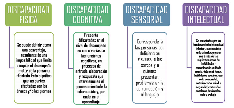 - Discapacidad motora: Se define como deficiencia sensorial transitoria o permanente en el sistema óseo, muscular, articulatorio y/o nervioso, que dificulta las habilidades motoras propias de su edad. Se evidencian limitaciones en la actividad de estas personas y en su participación relacionada con factores ambientales y personales.